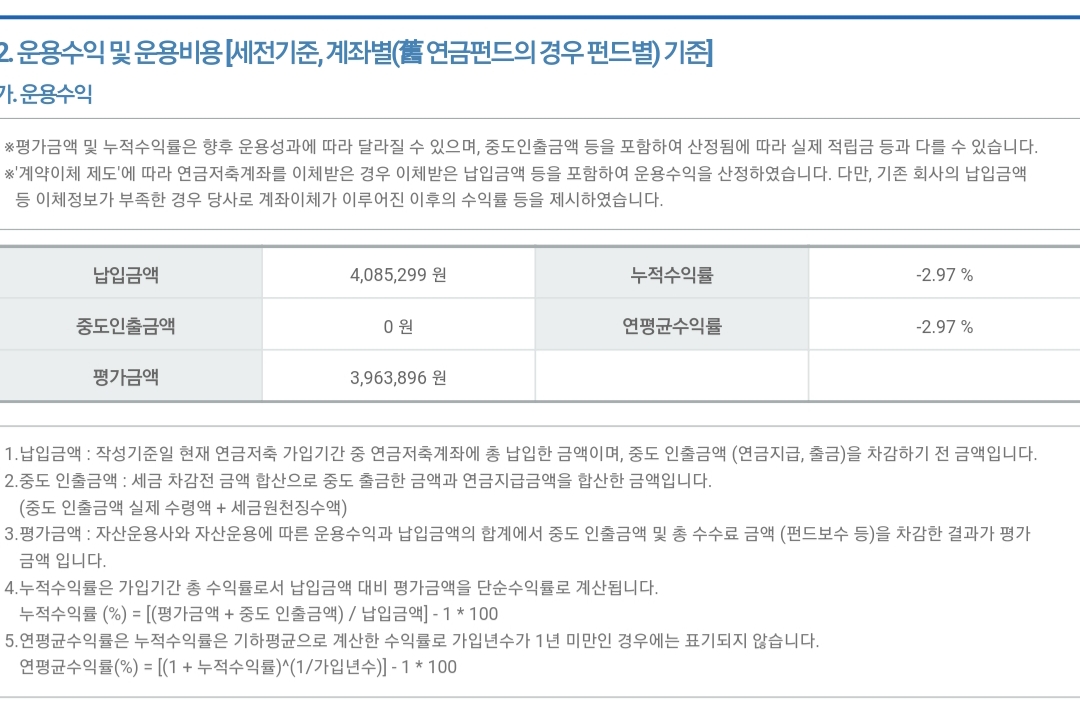 평가금액은 자산운용사와 자산운용에 따른 운용수익과 납입금액의 합계에서 중도 인출금액 및 총 수수료 금액(펀드 보수)을 차감한 결과가 평가금액이라고 합니다.