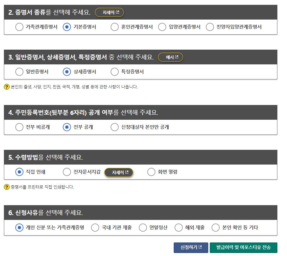 자녀 기준으로 가족관계증명서와 기본증명서를 다운 받을 때 상세증명서로 주민등록번호는 전부 공개로 설정하고 받습니다.