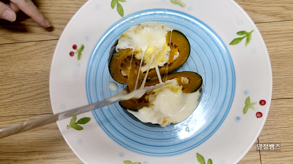 쭉쭉 늘어나는 치즈에 달걀과 단호박이 너무 잘 어울립니다.