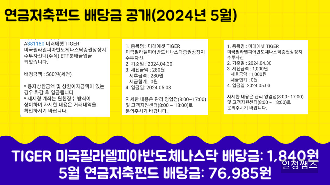 2024. 5월 연금저축펀드 etf 배당금 공개합니다. 10년 뒤에는 연금저축펀드 배당부자가 되어 있기를 꿈꿔봅니다.