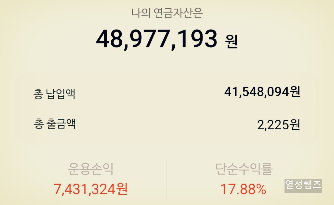 현재 제 개인연금저축펀드는 4,800만원이며 총 납입액은 4,100원이고 운영손익은 740만원입니다. 수익률로 보면 17.88%입니다.