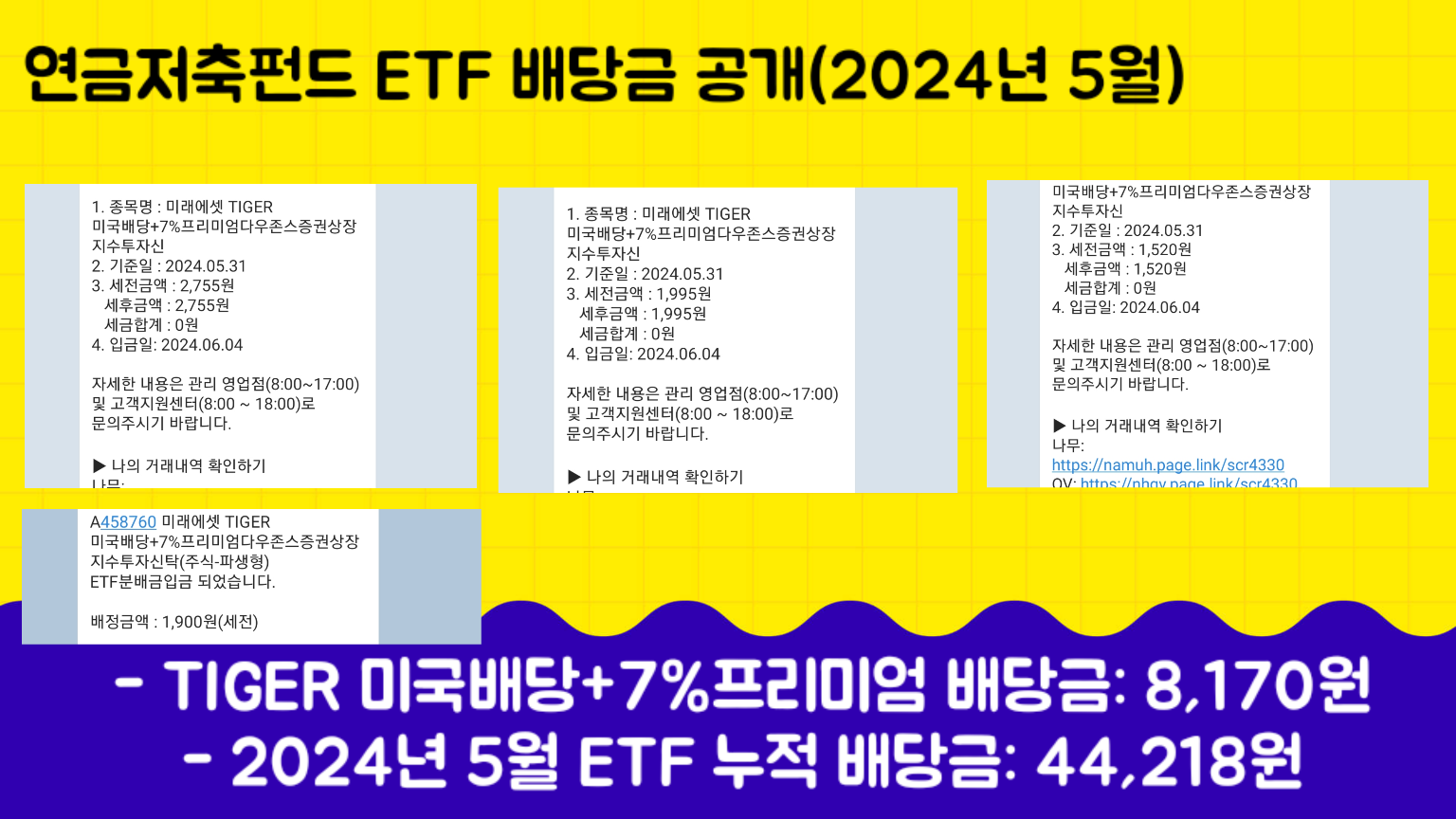 2024년 4월달부터 연금저축펀드 ETF 배당금을 정리하기 시작하였습니다. 과연 얼마의 배당금이 들어올까 궁금함과 함께 정리를 해 놓을 필요가 있어서 유튜브와 블로그에 기록으로 남기기로 했습니다.