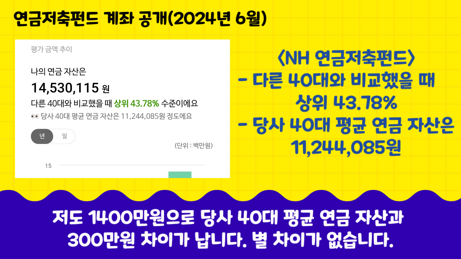 저도 1,400만원으로 당사 40대 평균 연금 자산과 300만원 차이가 납니다. 당사 40대 평균 연금 자산가 별차이가 없습니다.