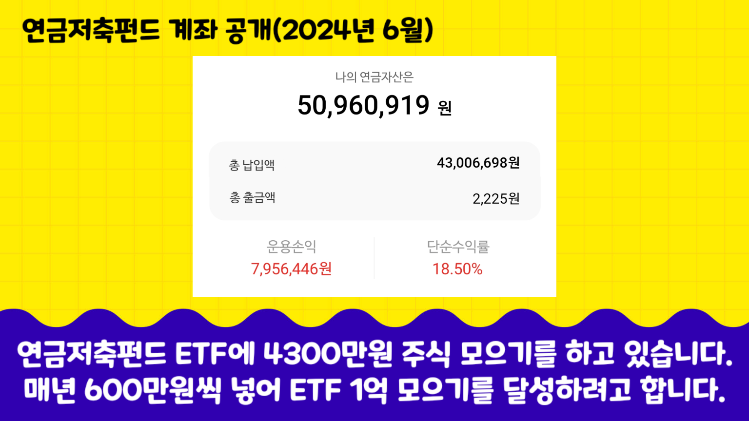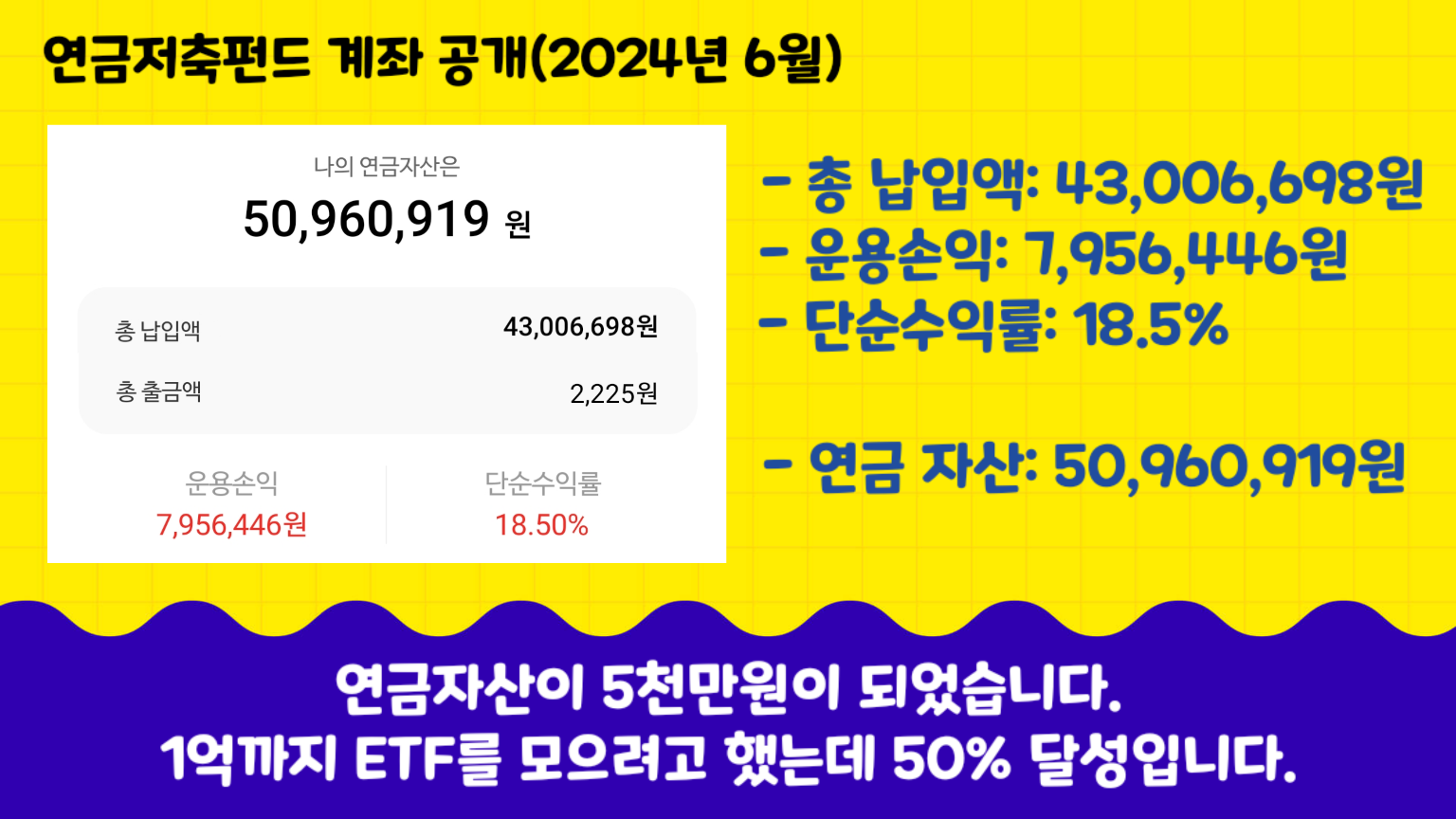 5천만원 달성, 연금저축펀드 계좌 공개(2024. 6월)합니다. 연금저축펀드로 ETF 주식모으기를 하고 있습니다.