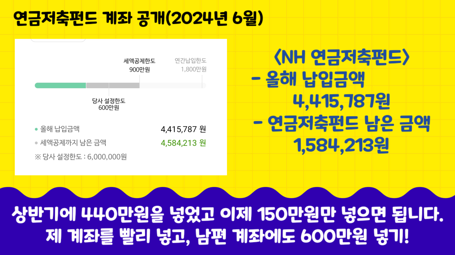 상반기에 440만원을 넣었고 이제 150만원만 넣으면 소득공제 연금저축펀드 한도 600만원을 채우게 됩니다. 제 계좌를 빨리 넣고, 남편 계좌도 600만원을 넣으려고 합니다.