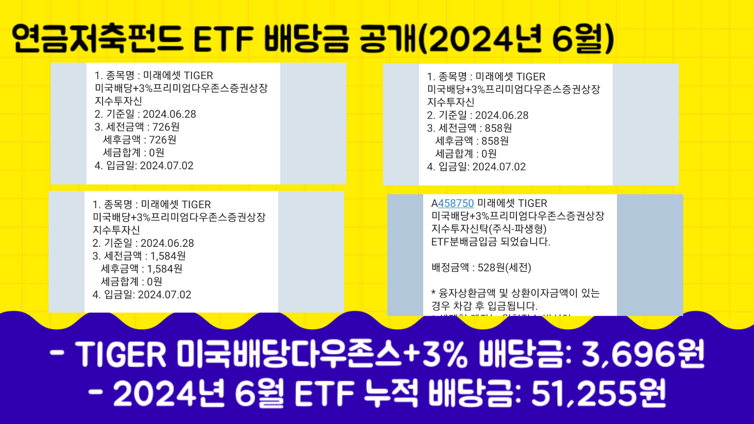 - TIGER 미국배당+3%프리미엄다우존스 ETF 배당금: 3,696원