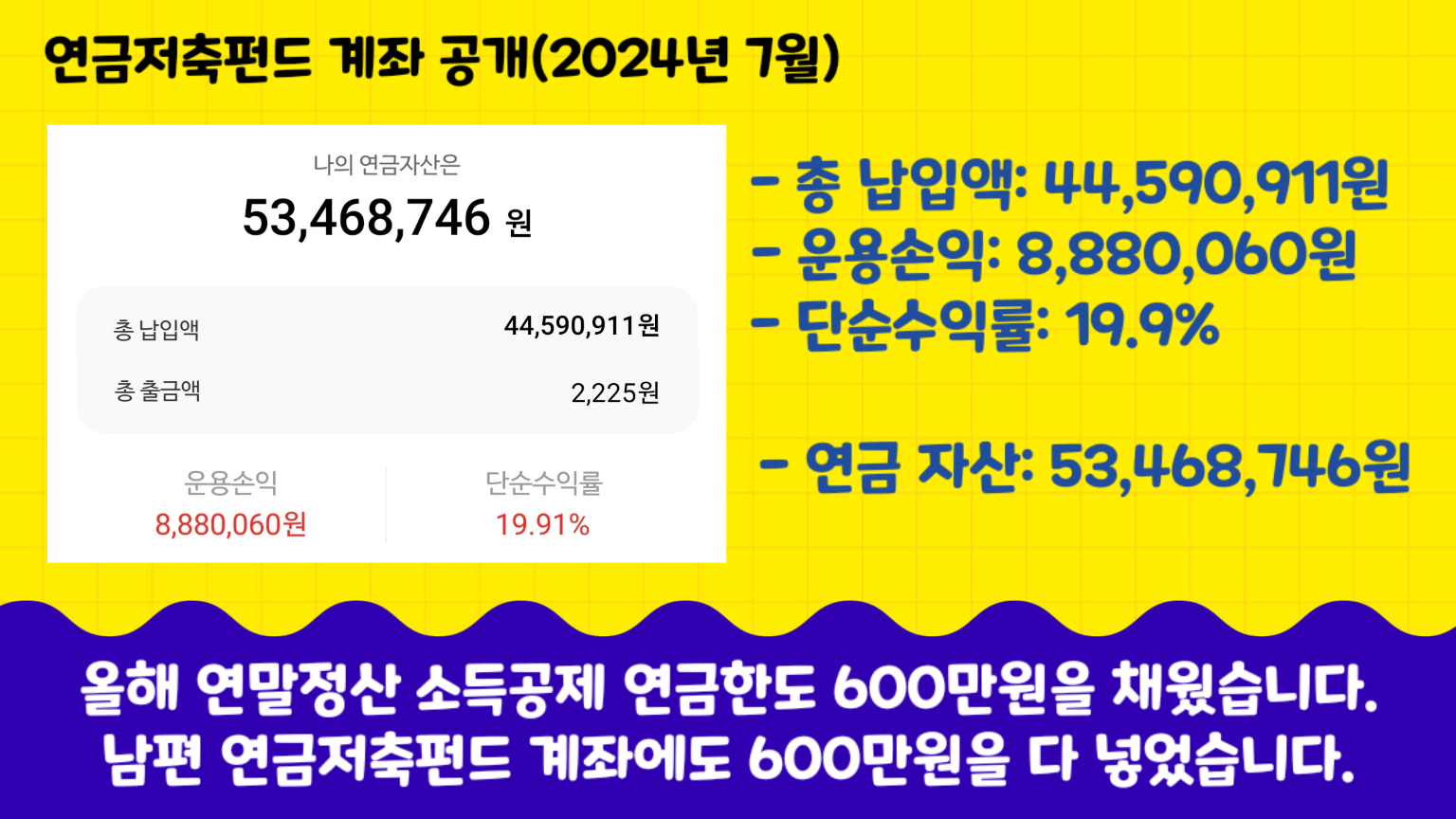 수익률 19%, 5,340만원 달성, 연금저축펀드 계좌 공개(2024년 7월)합니다.