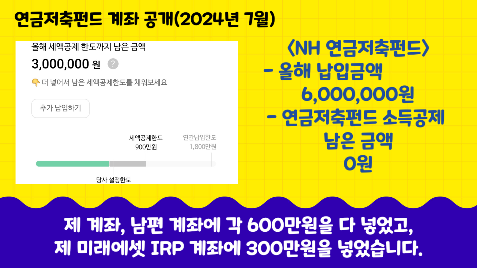 7월말이나 8월에는 남편 IRP 계좌를 만들어서 300만원을 넣을 수 있도록 해야겠습니다.