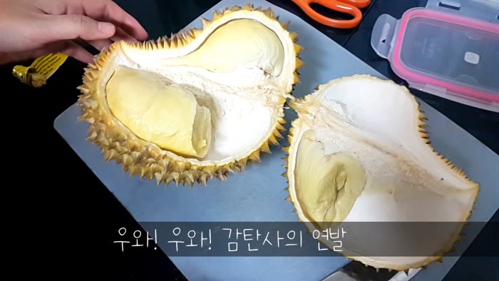 두리안을 까니 냄새가 더 나네요. 깜짝 놀랐네요.